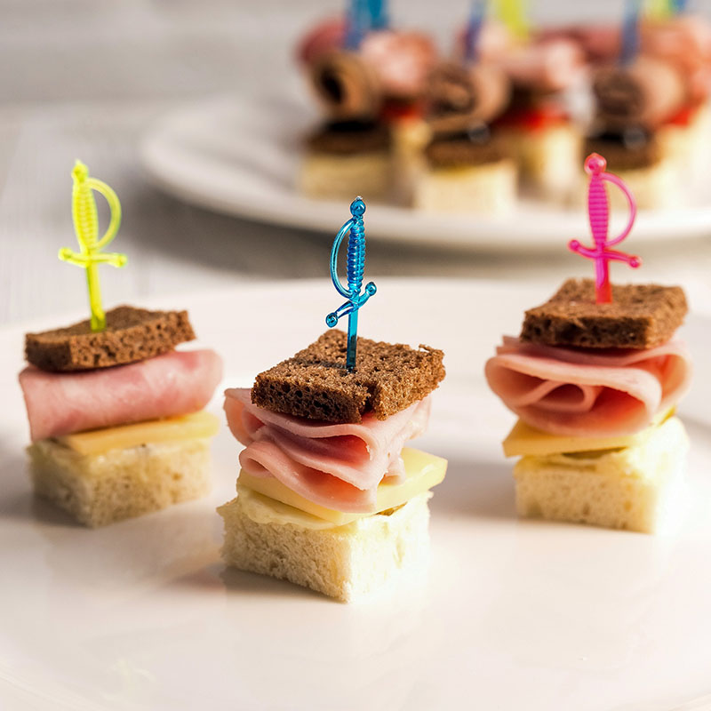 - Формат мероприятия — для официальных приёмов лучше использовать лаконичные деревянные или металлические пики, для детских праздников — яркие пластиковые.
