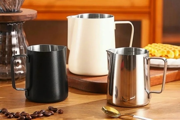 - Форма: Высокие стенки помогают создавать правильную текстуру молочной пены, а узкий носик обеспечивает точность при латте-арте.