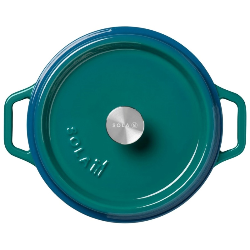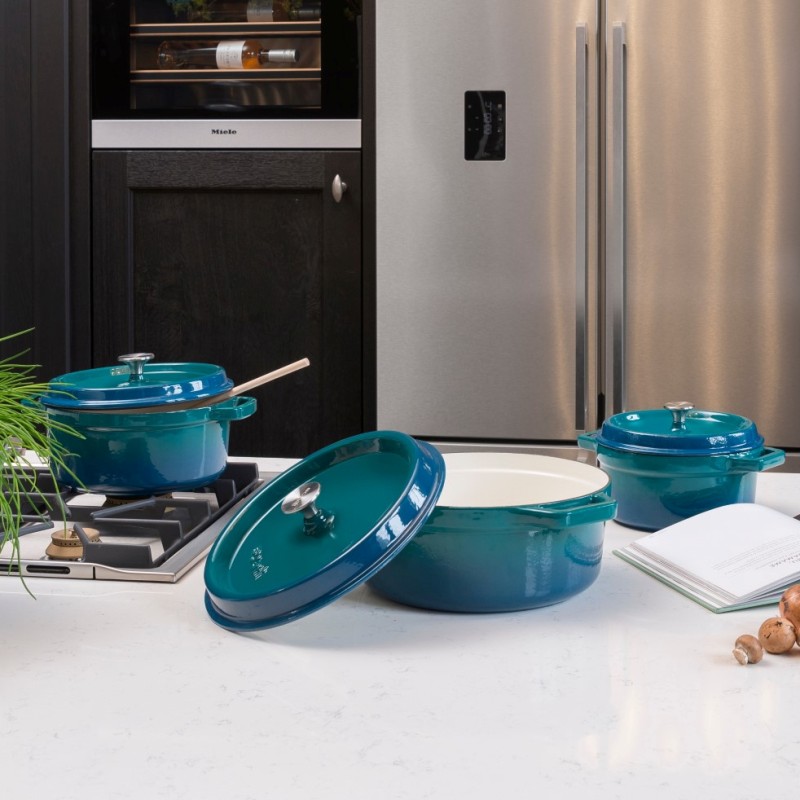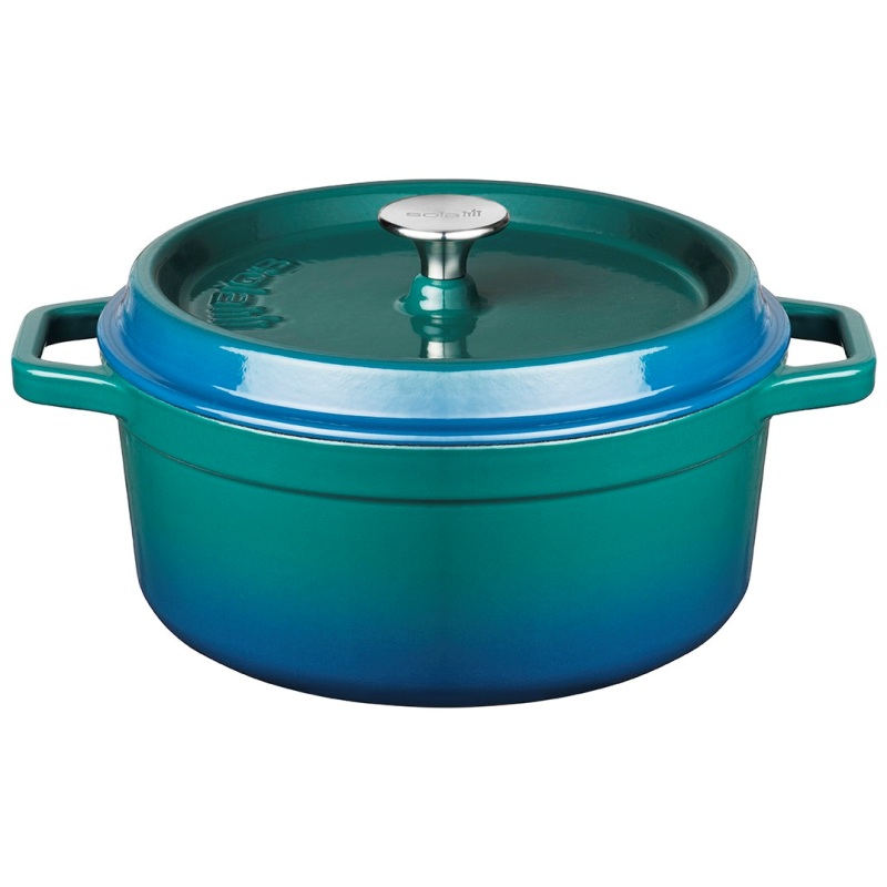 Кокотница с крышкой, горшочек для запекания и подачи Ø20см (сине-зеленый - артикул 13BRAB 001), изготовленный из чугуна имеет красивый ностальгический дизайн с культовой ручкой из нержавеющей стали.