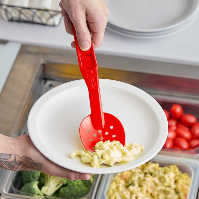 Сервировочная перфорированная ложка Camwear® Deli Spoon 28,3 см красного цвета Cambro (арт.SPOP11CW404) - это экономичное решение по сравнению с металлическими ложками, которые не тускнеют, не гнутся и не оставляют вмятин.