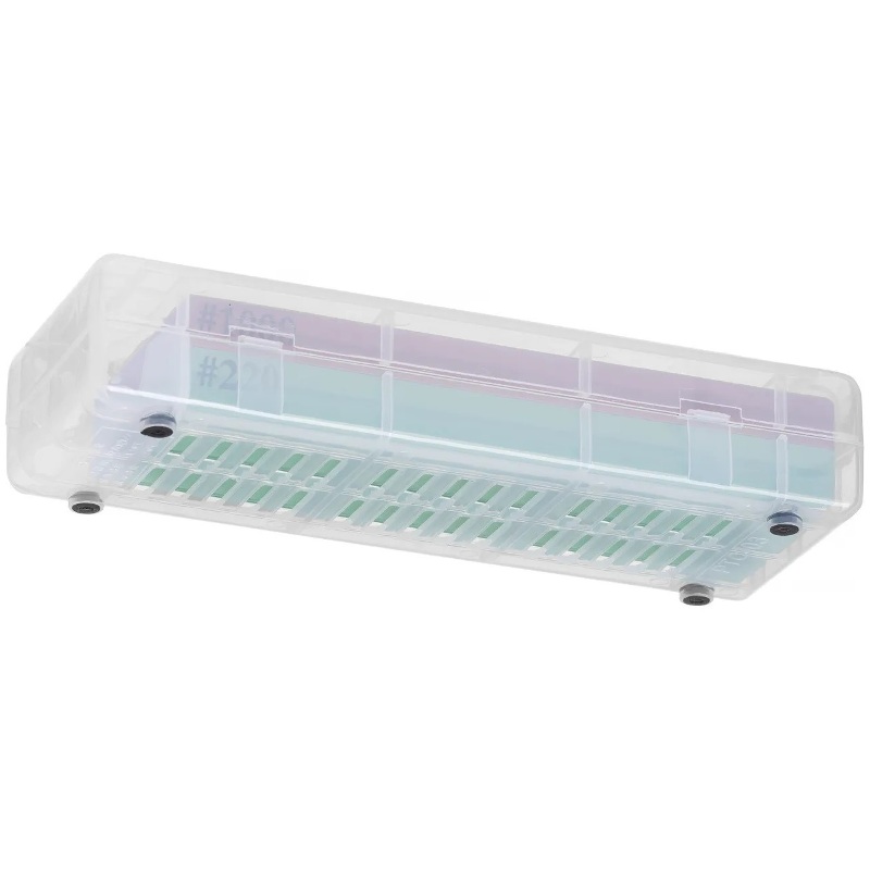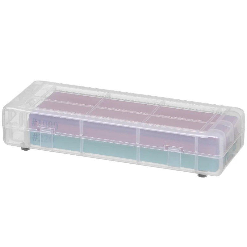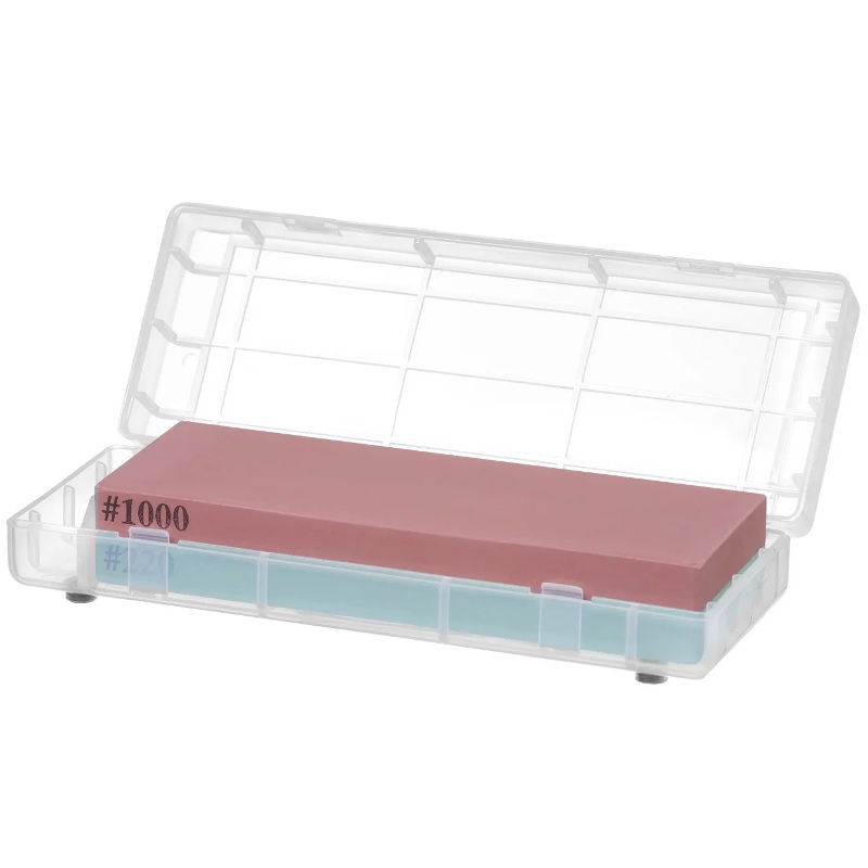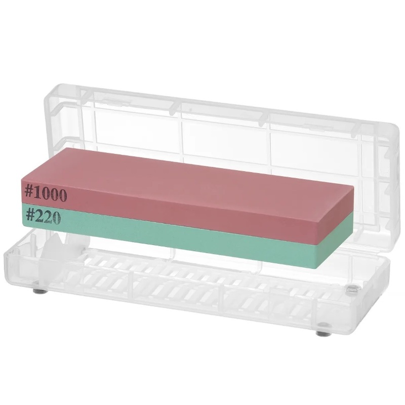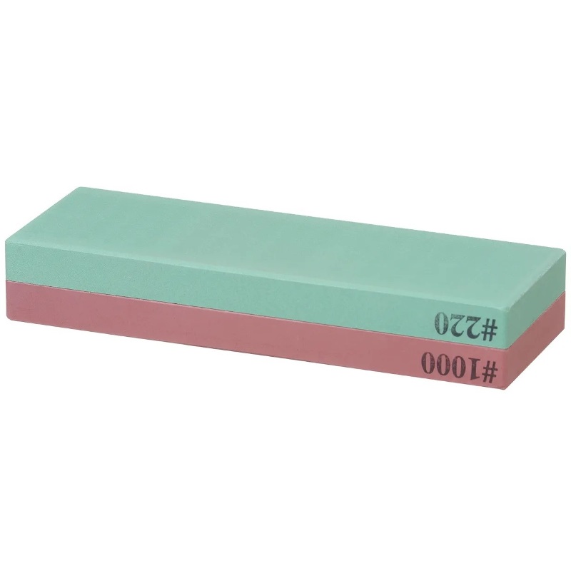 Точильный камень двусторонний и состоит из 2 пластин с 2 разными размерами зернистости: 1000/220.