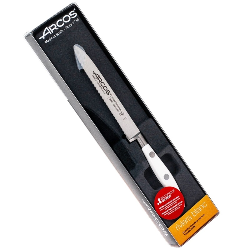 Нож для томатов 130мм RIVIERA BLANC (арт.232024) с белой рукояткой с серрейторным краем предназначен для быстрой и аккуратной нарезки помидоров без повреждения мякоти.