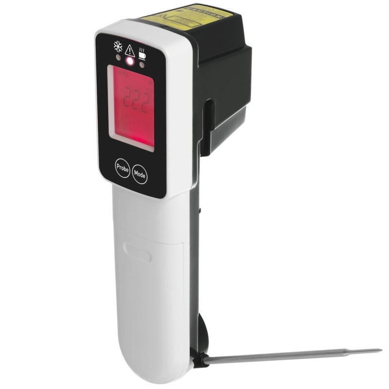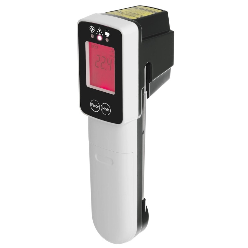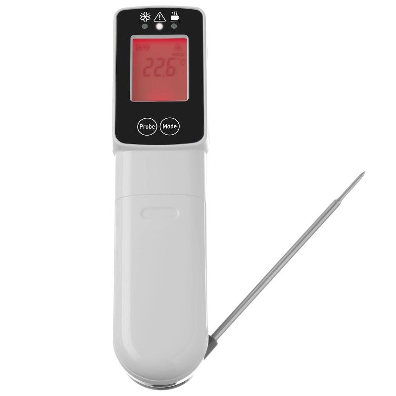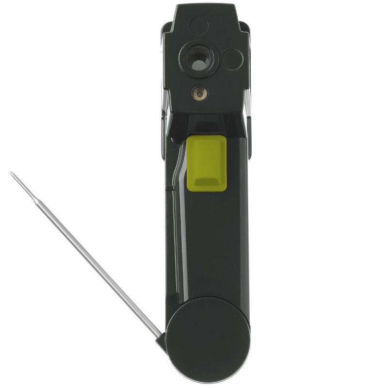 Сканирует температуру инфракрасным излучением или складным датчиком из нержавеющей стали длиной 90 мм.