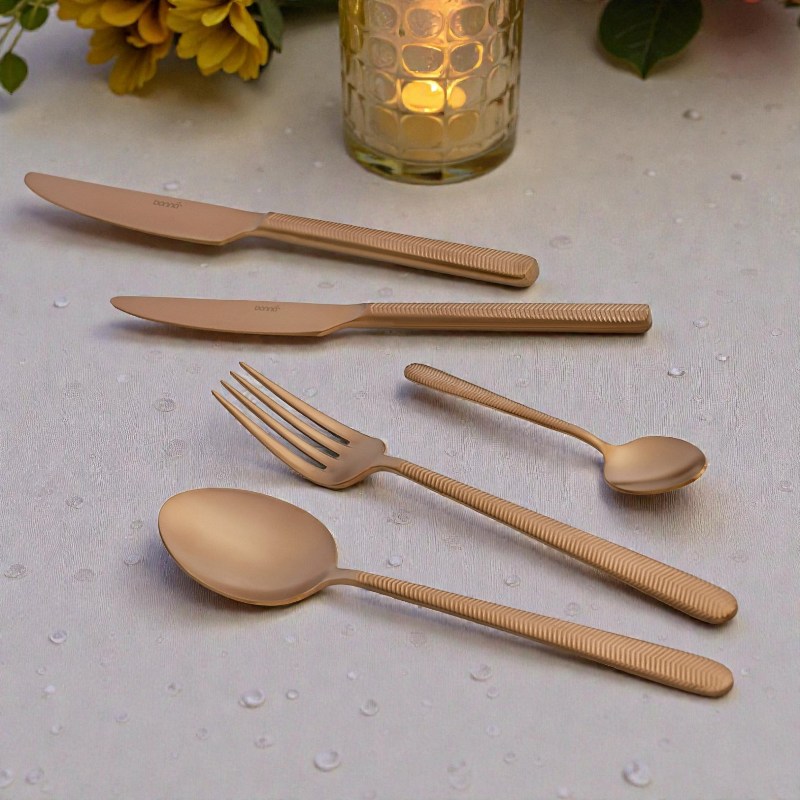 - Матовый бронзовый оттенок добавляет глубину и стиль, позволяя приборам сочетаться практически с любой посудой — от минималистичной фарфоровой до декоративной керамики.